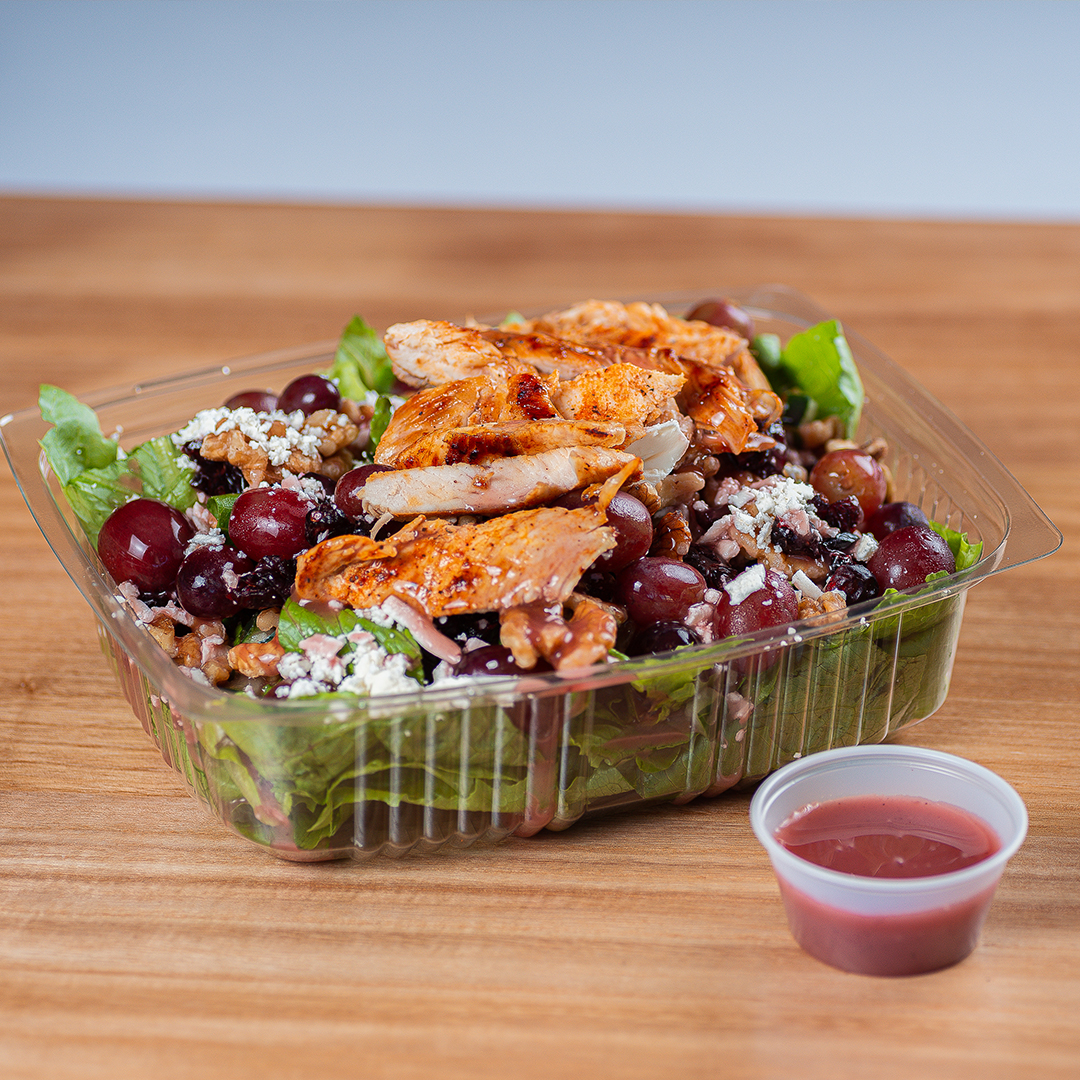 Chicken Shawarma, uvas, cranraisins, feta, nueces, pepino en una cama de lechugas y un baño de Raspberry Vinaigrette