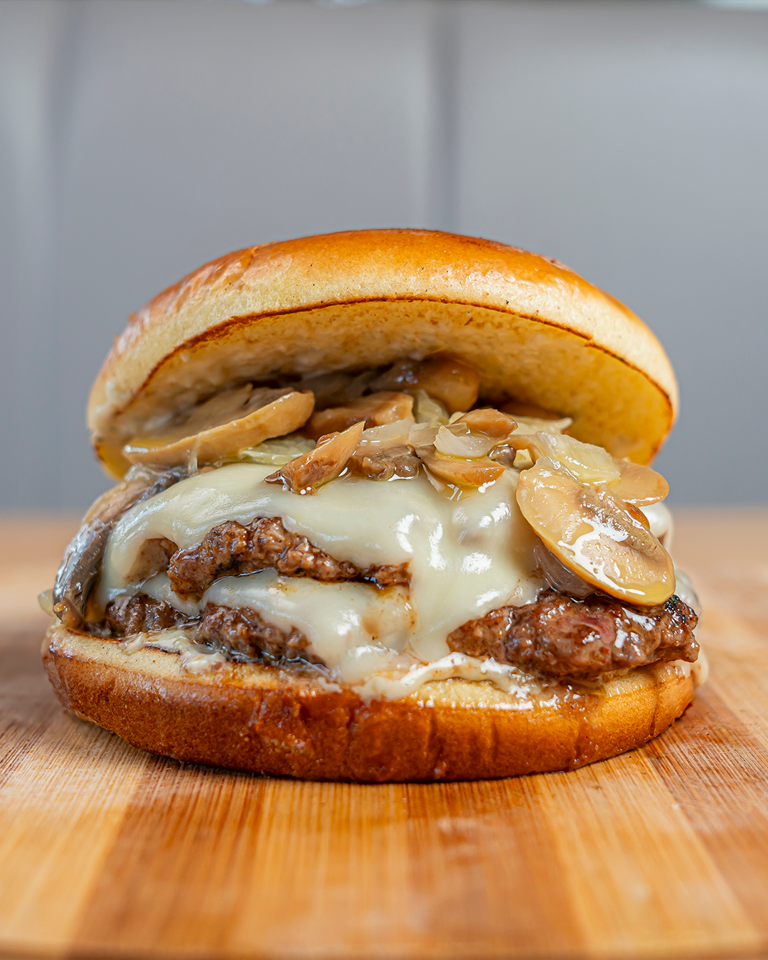 Carne fresca, champiñones, cebolla caramelizada, queso suizo