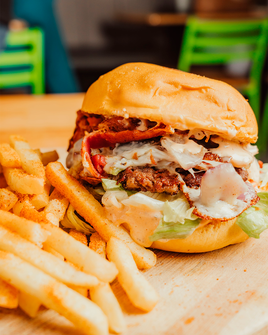 Carne fresca, queso mozzarella, cebolla y chile dulce salteado con tocino, lechuga, tomate y nuestra deliciosa chipotle ranch