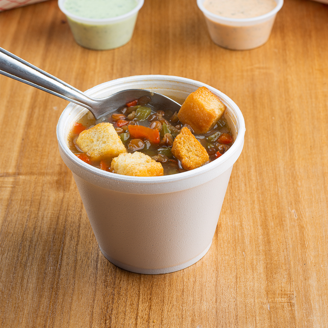 Con tocino, pimentos y crutones